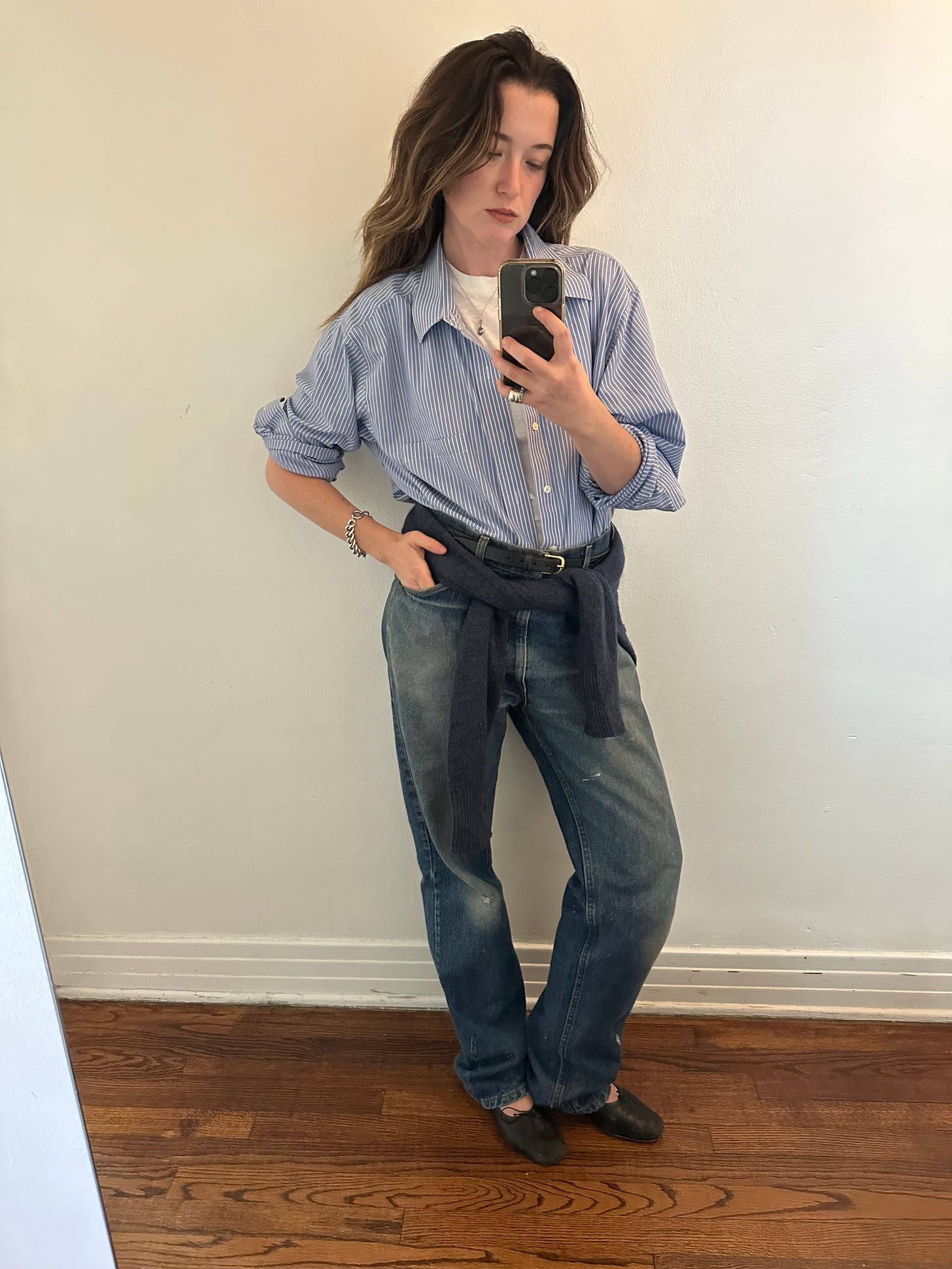 I’d describe it as comfortable and layered: Levi’s jeans, a long-sleeve shirt, a hoodie, a puffer jacket, a beanie, and a pair of boots.