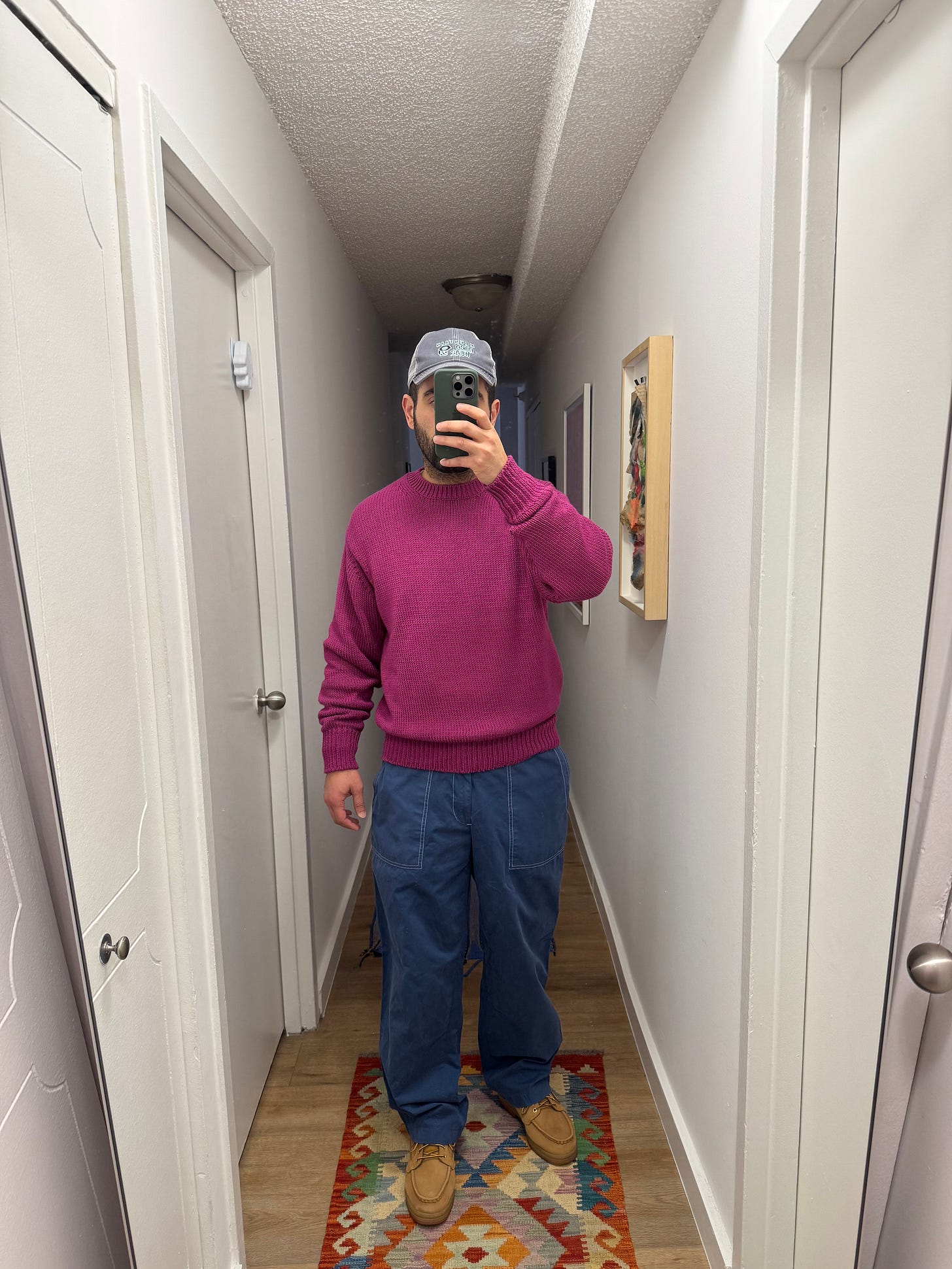 Anything from my extensive sweatshirt collection will do. This particular one from Brycelands has the perfect crop and semi-exaggerated features of a 1940s baseball sweatshirt. It’s incredible.