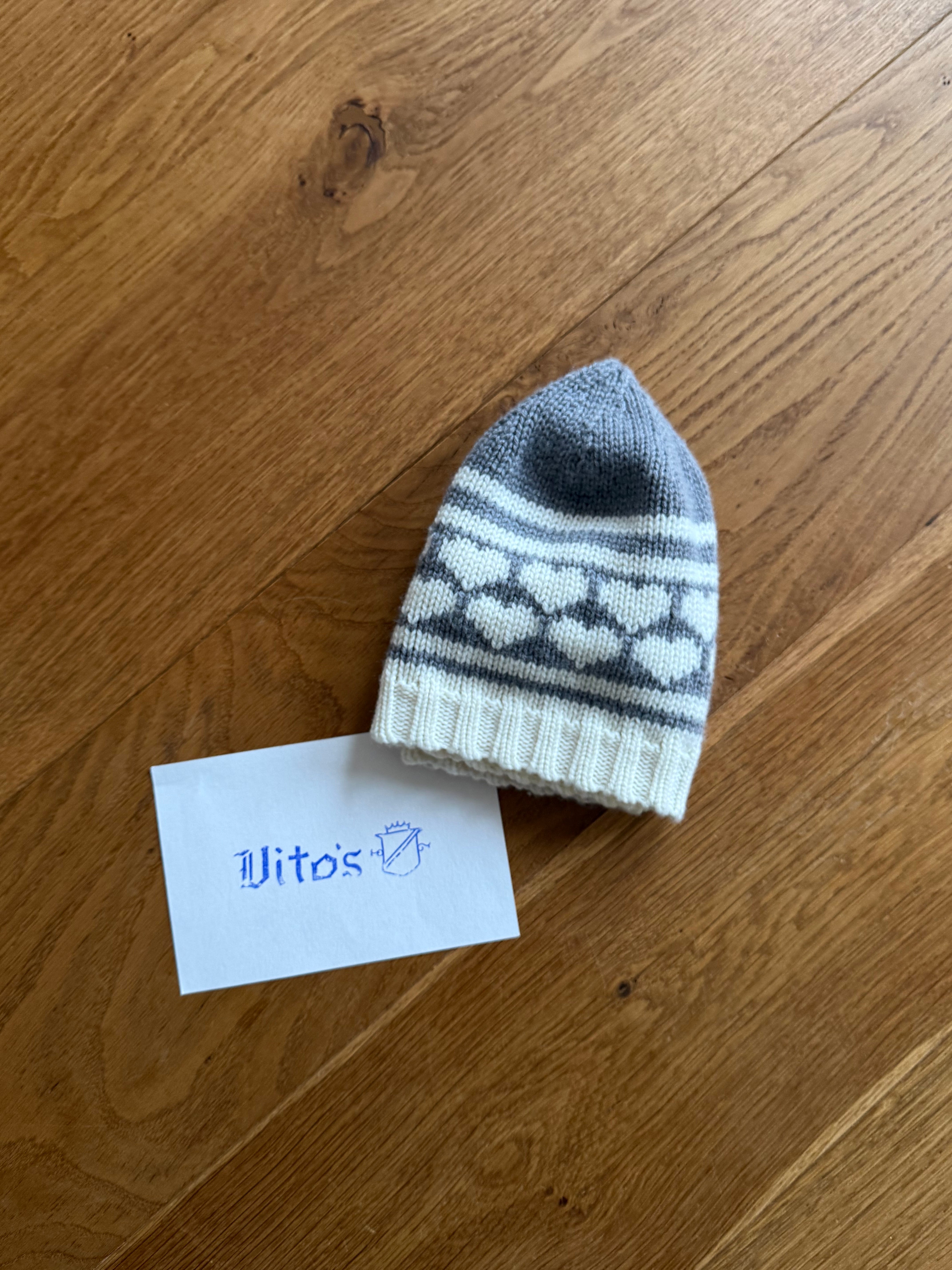My friend Victor recently launched his own brand, Vito’s, and his mom makes these bangin’ knit caps with little hearts.