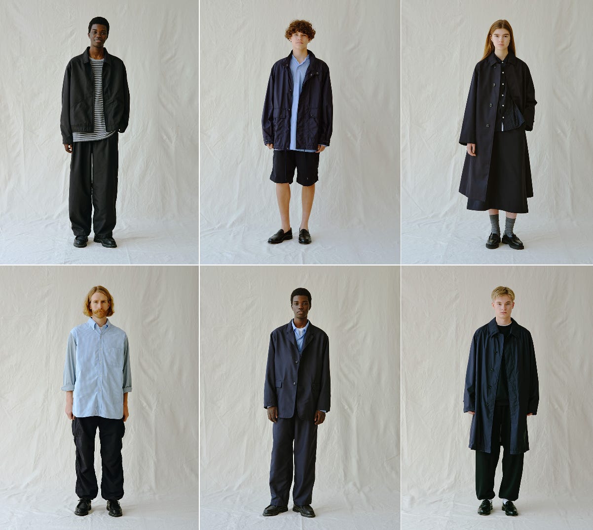 What excites me about the first is the way we were able to reinterpret workwear through rich, tactile materials like vegan leather and silk nep. In the second, we expressed workwear in a more refined direction, using a subtly lustrous fabric that gives it a slightly formal feel.