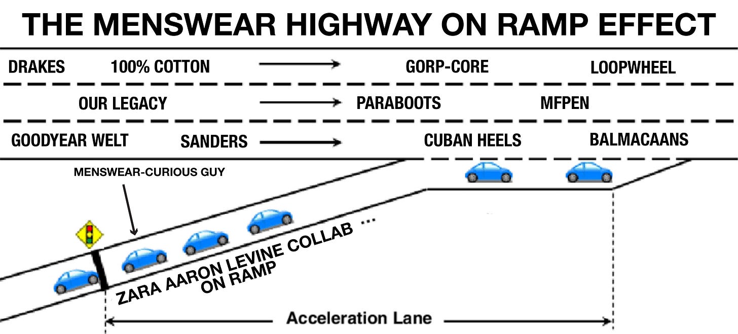 At one point, we were all new to this. A collab like this introduces someone who is slightly interested in menswear to Aaron Levine as a reference point, and it opens the door to a whole new world of brands.