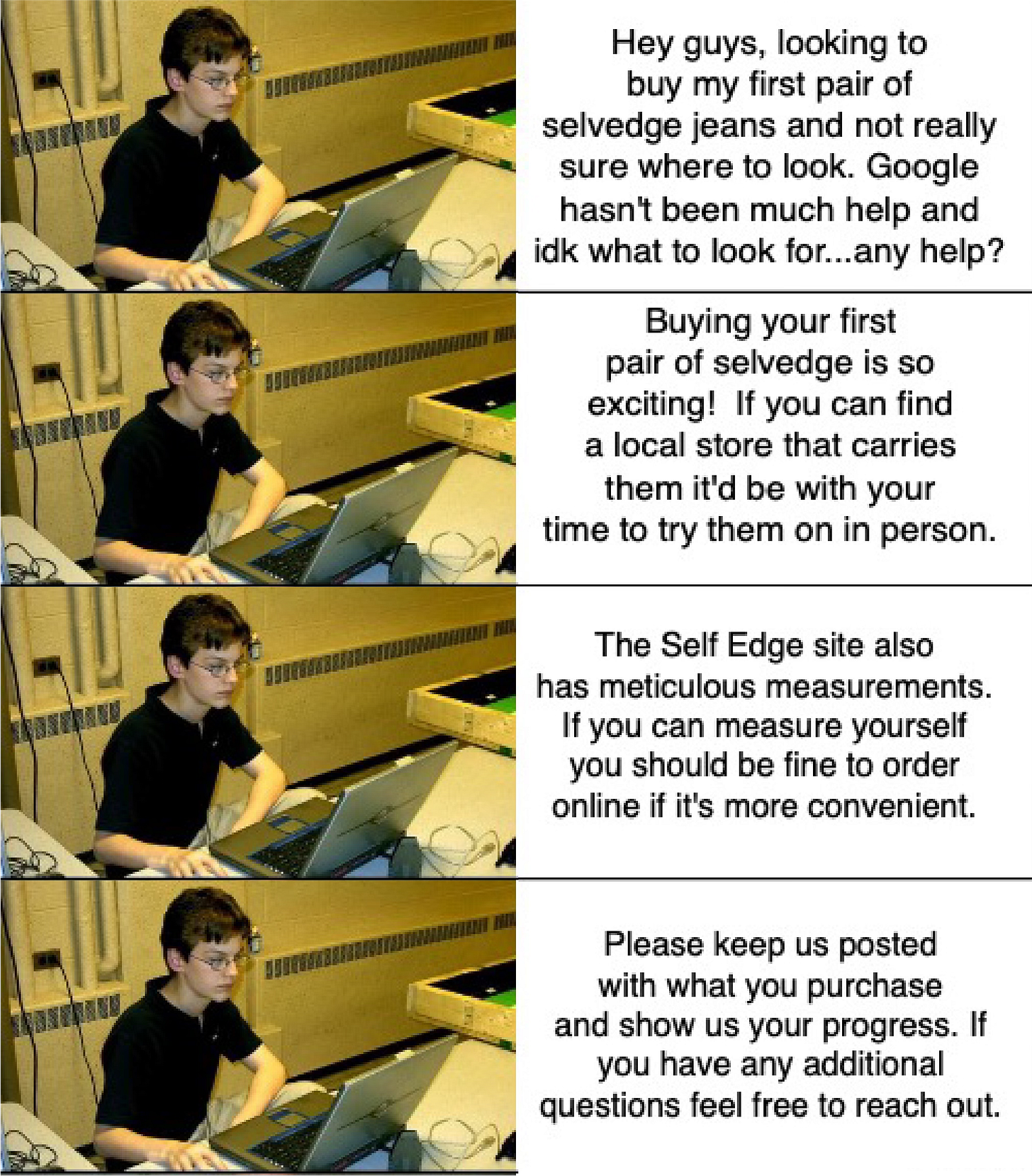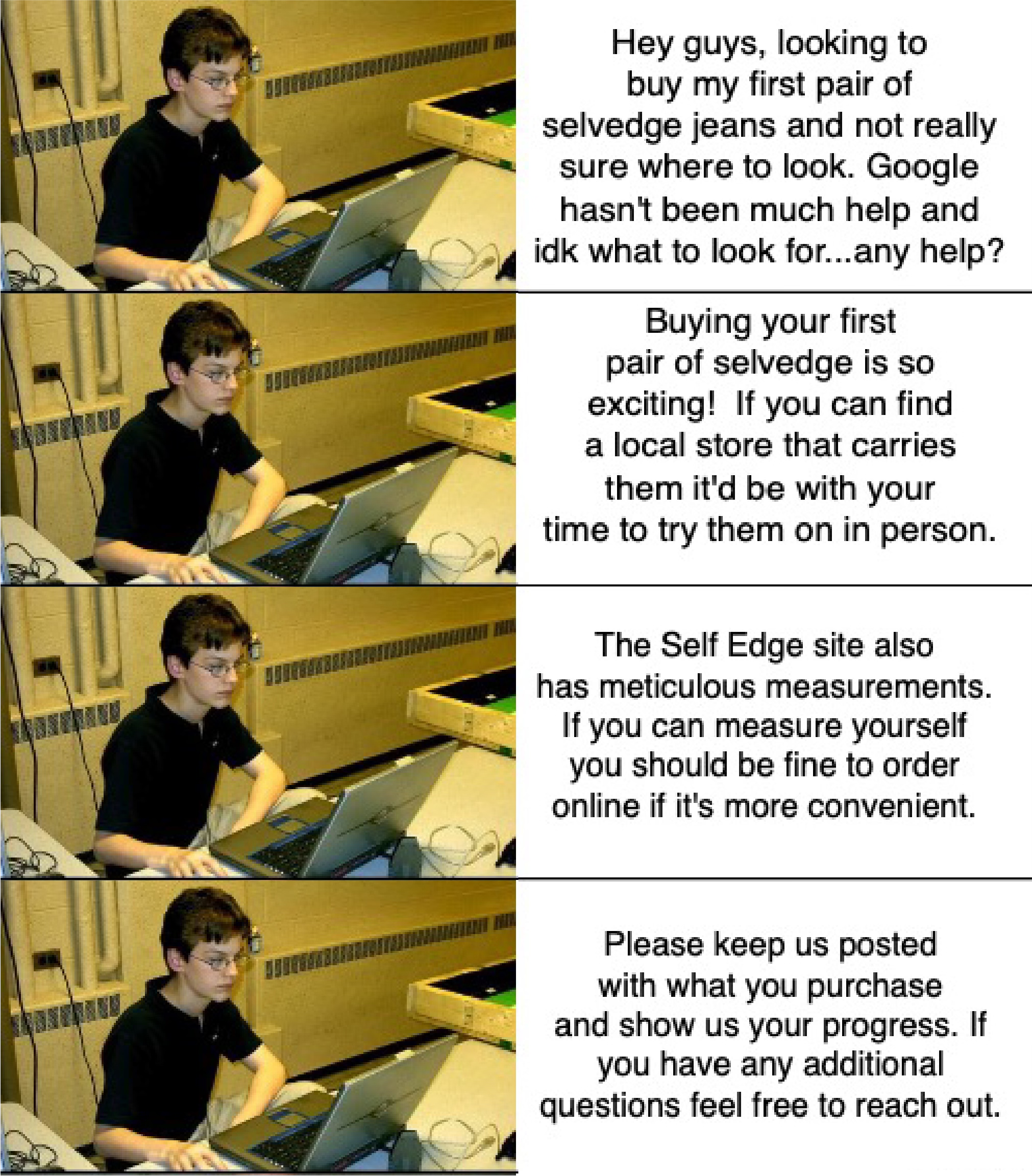 Bro…the guy you’re intimidated to ask a question to is a nerd that’s currently in a forum arguing about how often you should wash your denim. He hasn’t spoken to a girl face-to-face in years.
