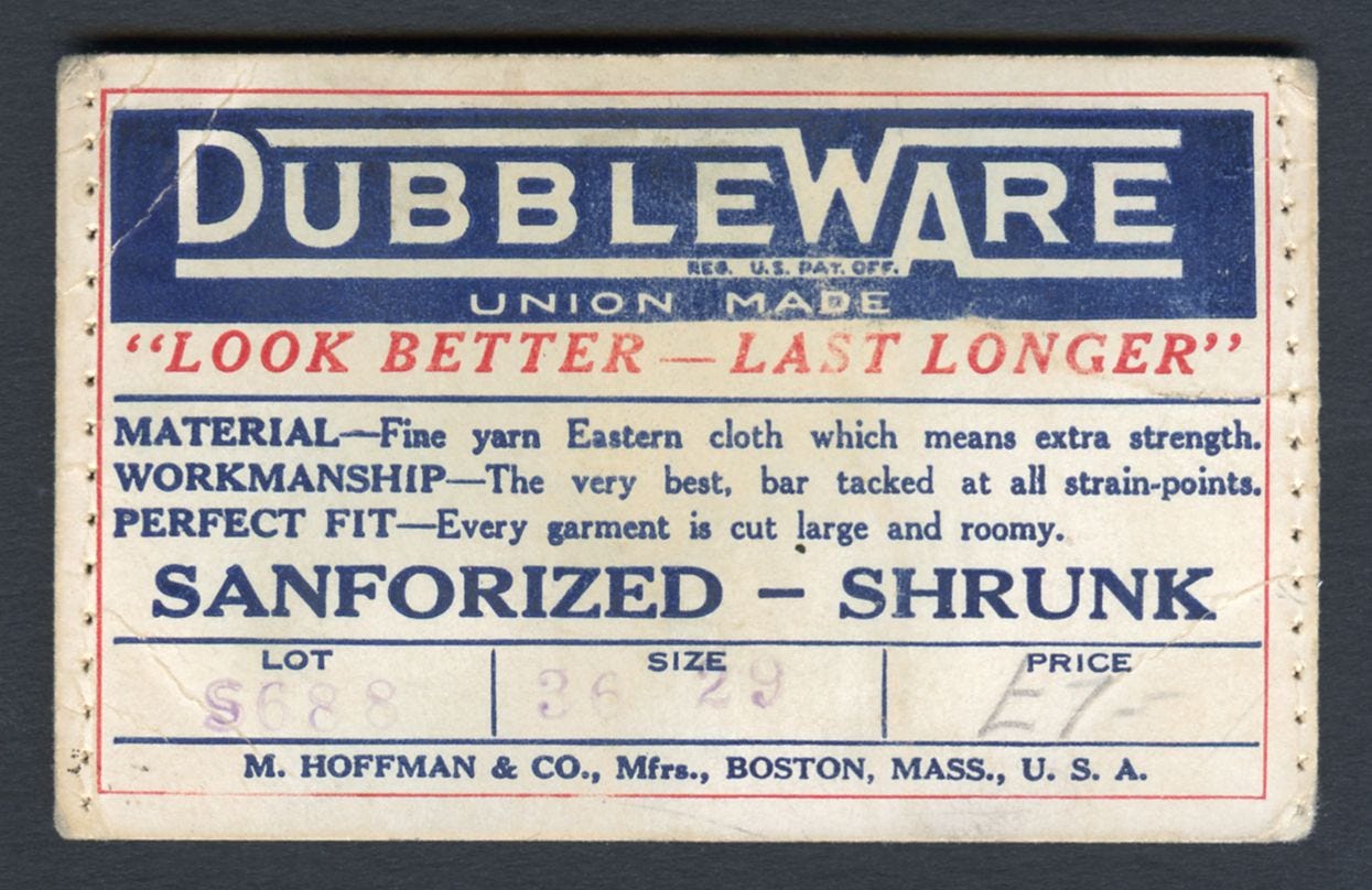 Dubbleware was a family-owned business founded in Boston, Massachusetts, in 1918 by manufacturer M. Hoffman. Over the years, the business waned, and Dubbleware officially ceased garment production in 1975.