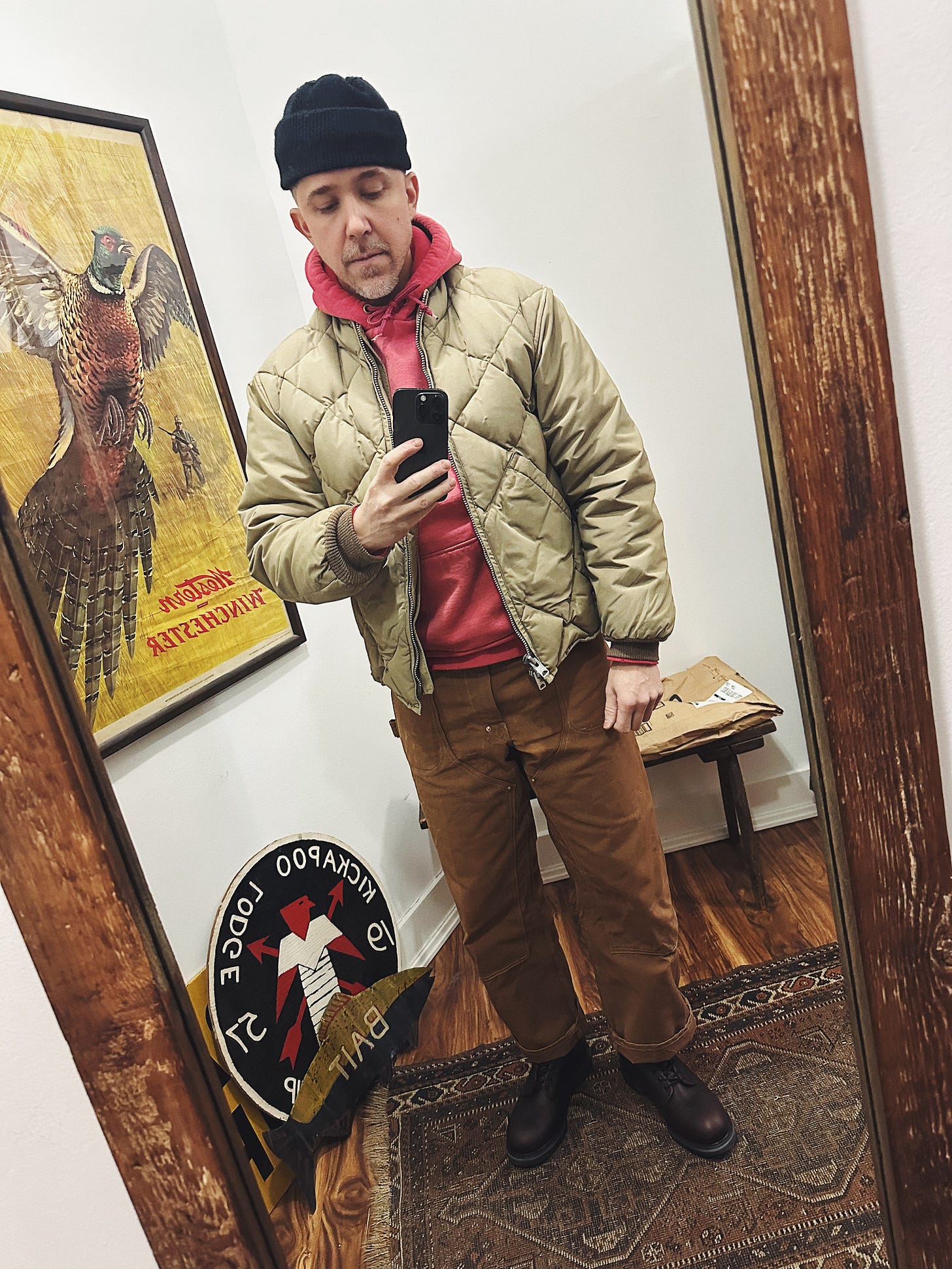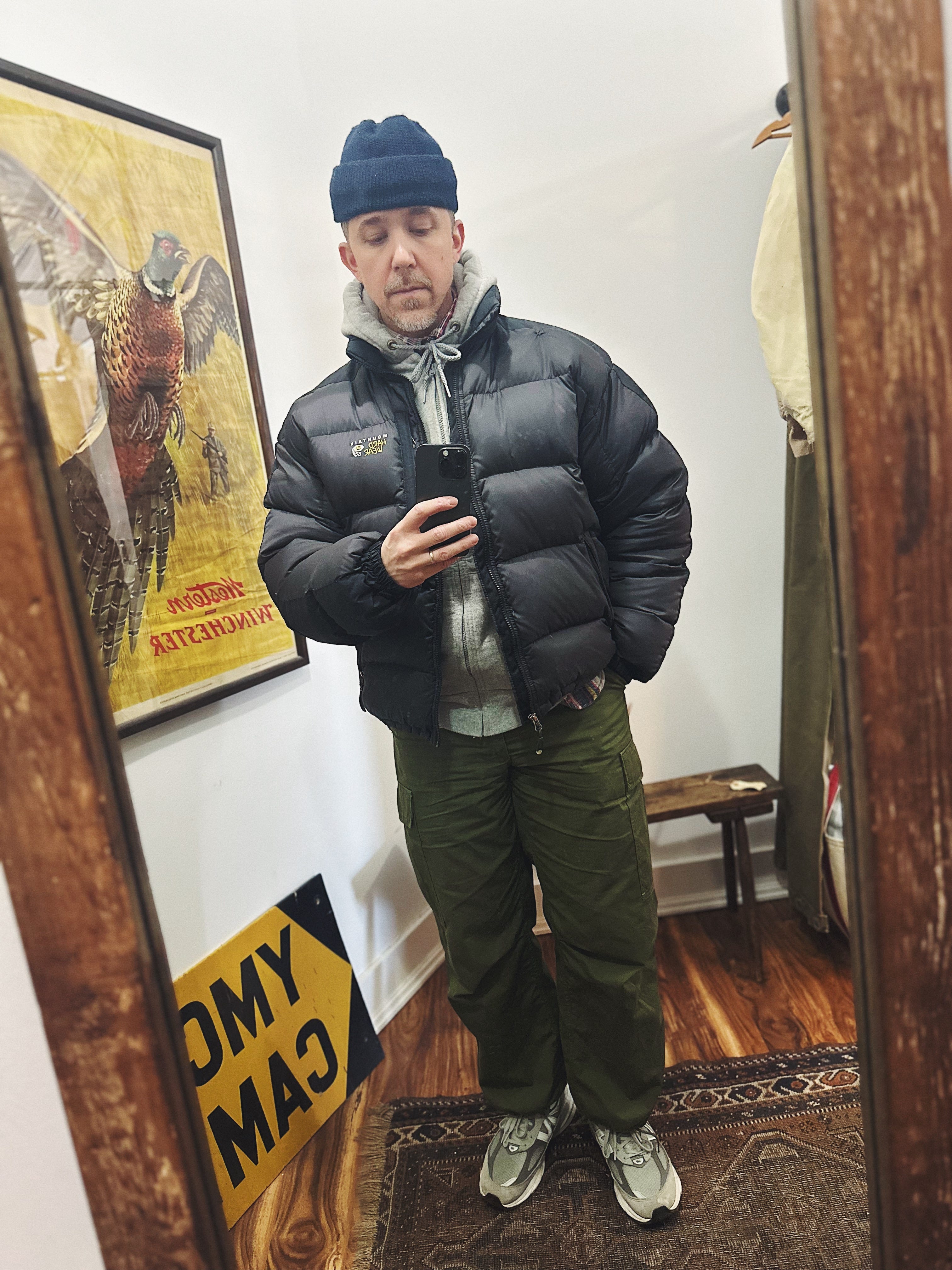 There’s almost always a vintage hoodie and/or cotton flannel involved, and one of dozens of pieces of outerwear from my collection—but most days, it’s a vintage Eddie Bauer Skyliner or Kara Koram parka.