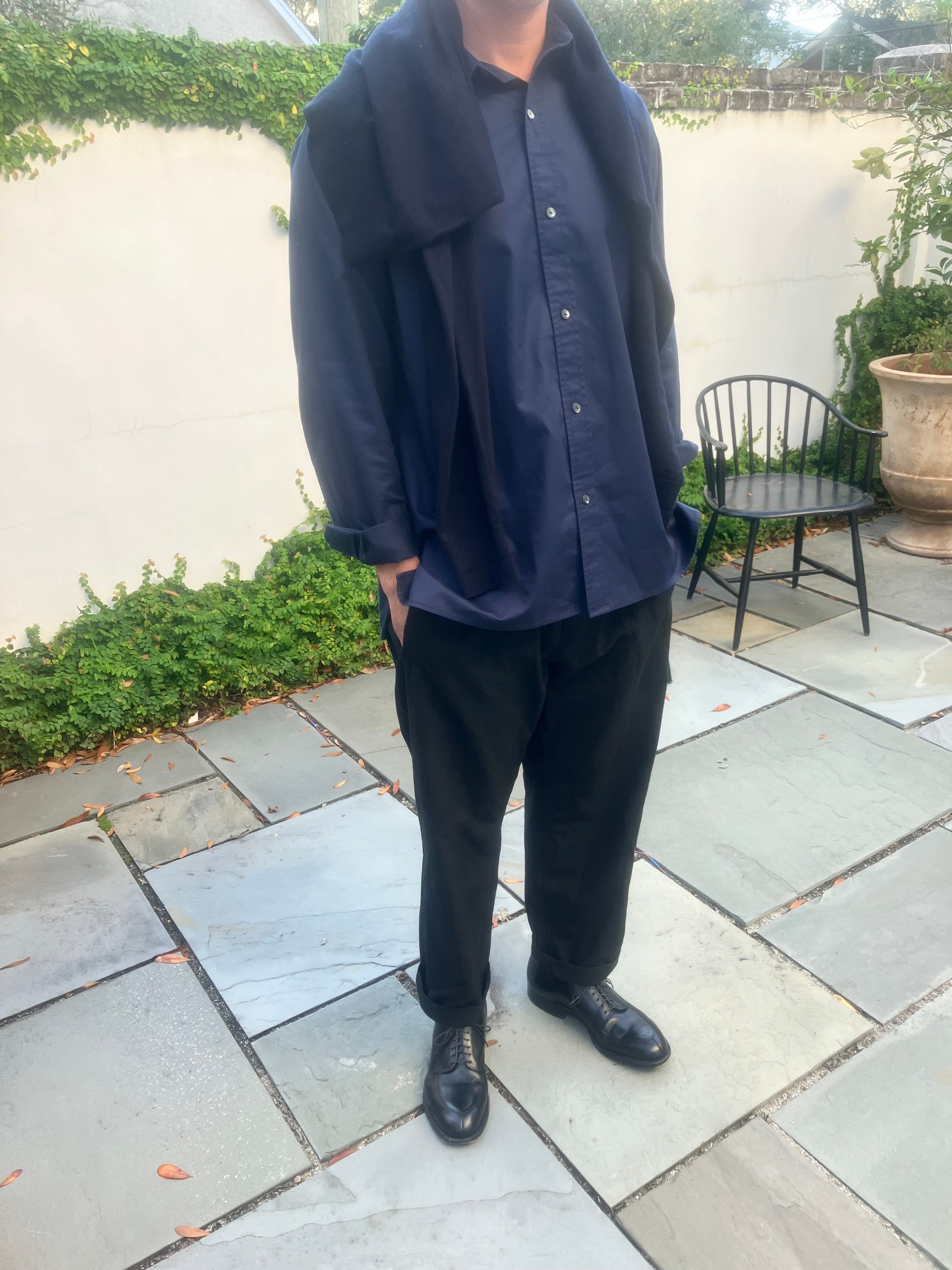 We got a sample of our next fabric release for RIVER, our men’s style for E.M. Reitz. It’s a dense navy twill, and I can’t take it off. The fabric feels great on the skin and has just enough weight to feel right for the season.