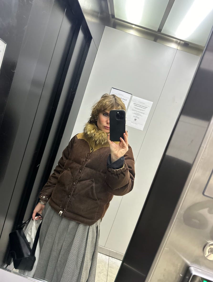 My vintage BAPE corduroy puffer with a fox collar—the piece I always return to and love. I’ve always been into capes, and this winter I’m also loving my Purple Label puffer cape and my custom Pia Wallén cape, which I’ve had for a couple of years; she even designed it to bike in.